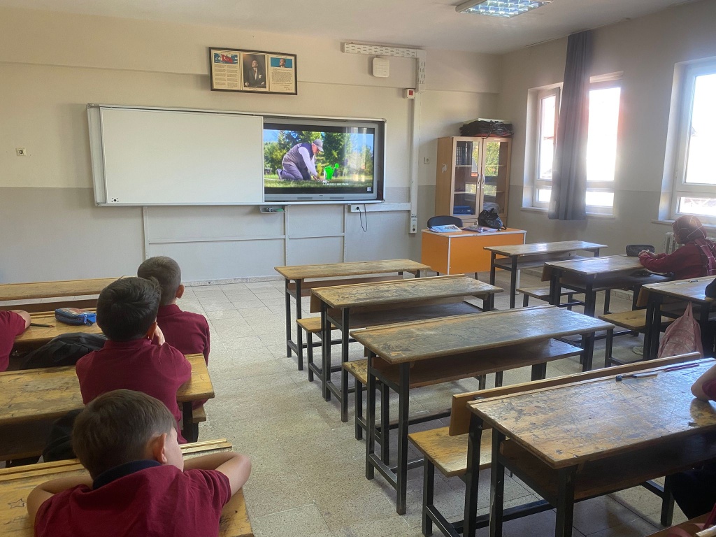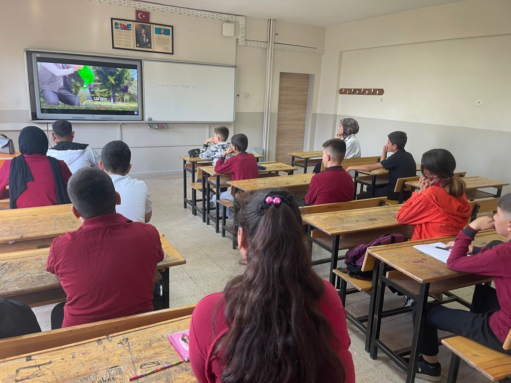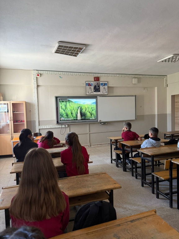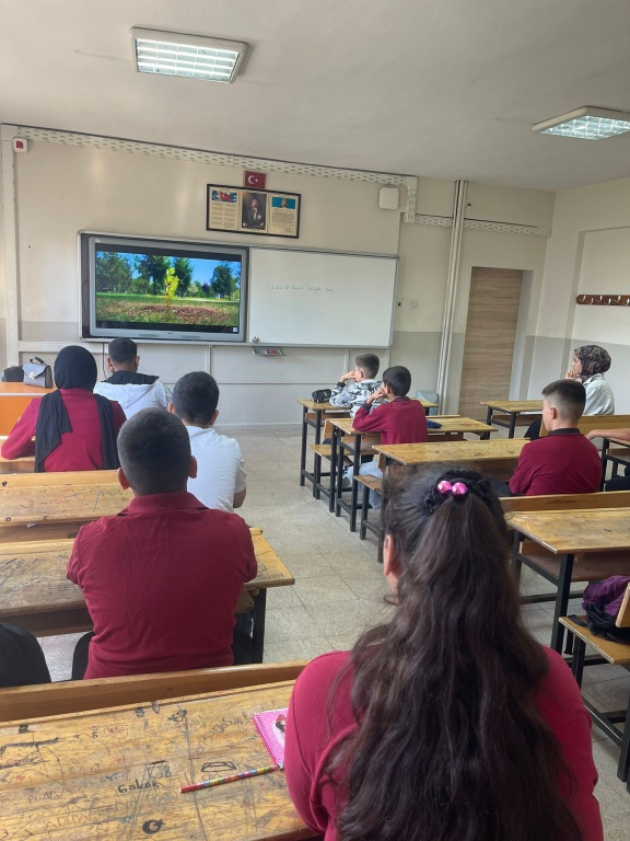 Millî Eğitim Bakanlığının Türkiye Yüzyılı Maarif Modeli ve İklim Değişikliği Eylem Planı doğrultusunda “Çevre, Afet, Risk Azaltma ve Eğitim Projesi (ÇARE)” kapsamında hazırlanan bu çalışma, ortaokul öğrencilerimizin çevre ve iklim okuryazarlığı ile afet bilincini küçük yaşlardan itibaren kazanmalarını hedeflemektedir. Dünyamızın karşı karşıya olduğu iklim krizi ve çevresel sorunların her geçen gün arttığı bu dönemde, çocuklarımızın bilinçli, duyarlı ve çözümün parçası olabilen bireyler olarak yetişmesi en büyük önceliğimizdir. Amacımız, öğrencilerimizin sadece bilgi sahibi olmalarını sağlamakla kalmayıp aynı zamanda sürdürülebilir yaşam pratiklerini benimseyen, doğal kaynakları koruma sorumluluğu taşıyan ve çevresel sorunlara karşı çözüm odaklı düşünebilen bireyler olmalarını desteklemektir. Bu amaçlar doğrultusunda öğrencilerimizde farkındalık oluşturmak için ilk dersimizde tüm sınıflarımızda "İlk Ders Yeşil Vatan: Her Çocuk Bir Fidan" sinevizyon gösterisi izletildi.
